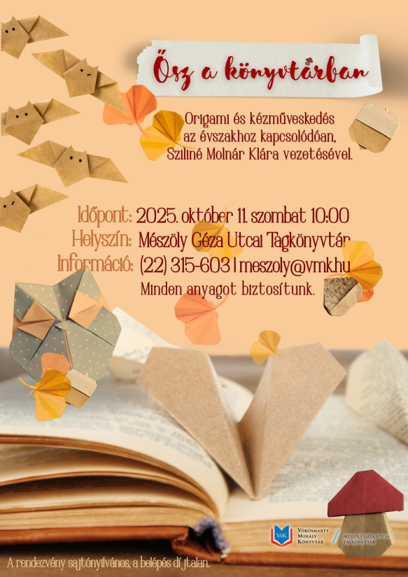 Origami és kézműveskedés az évszakhoz kapcsolódóan, Sziliné Molnár Klára vezetésével, a VMK Mészöly Géza Utcai Tagkönyvtárában.
