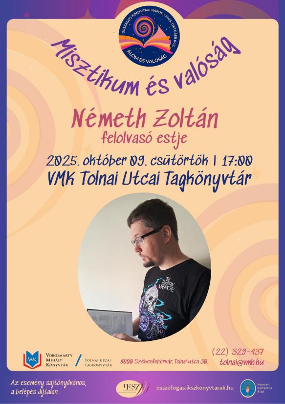 Németh Zoltán felolvasó estje a Vörösmarty Mihály Könyvtár Tolnai Utcai Tagkönyvtárában.