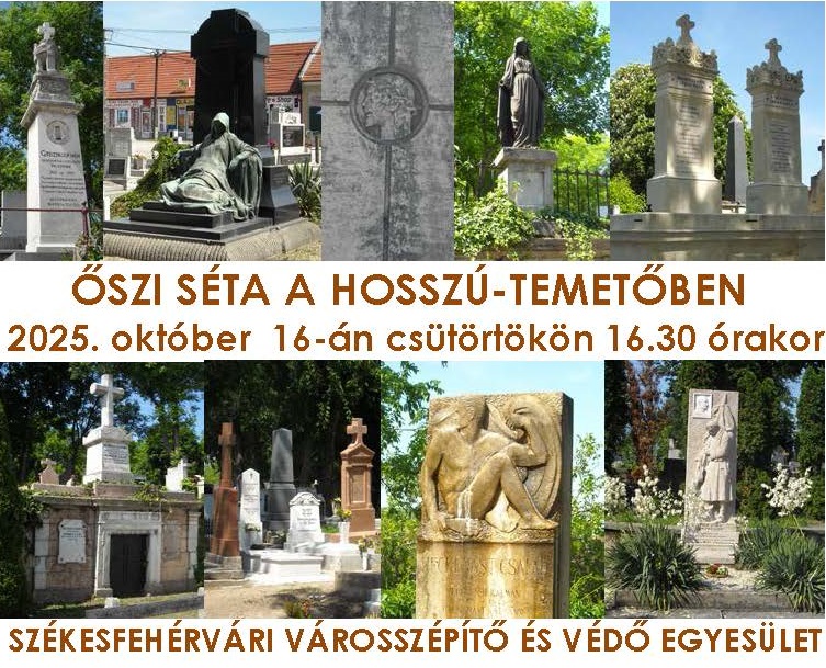 2025. október 16-án csütörtökön 16.30 órakor Folytatjuk többéves hagyományunkat, és az idén ősszel is temetői sétára hívjuk a Székesfehérvár várostörténete iránt érdeklődőket. POKLOSI PÉTER tanár úr, az egyesület elnöke, rendhagyó történelem órát tart az ott nyugvó neves személyiségek síremlékeinek és a művészi értékű alkotásoknak bemutatásával. Az elmúlt hónapokban ismét több különlegesen értékes síremlék, kripta felújítása készült el, amelyeket most tekinthetnek meg legelőször. Találkozás: a Hosszú-temető kápolnájánál (Székesfehérvár, Palotai út) A temetői sétán a részvétel ingyenes! Esőnap: 2025. október 17. péntek 16.30 órakor |