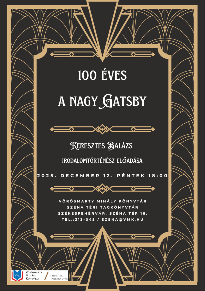 Keresztes Balázs irodalomtörténész előadása F. Scott Fitzgerald regényéről a Vörösmarty Mihály Könyvtár Széna Téri Tagkönyvtárában 2025. december 12-én 18 órától.