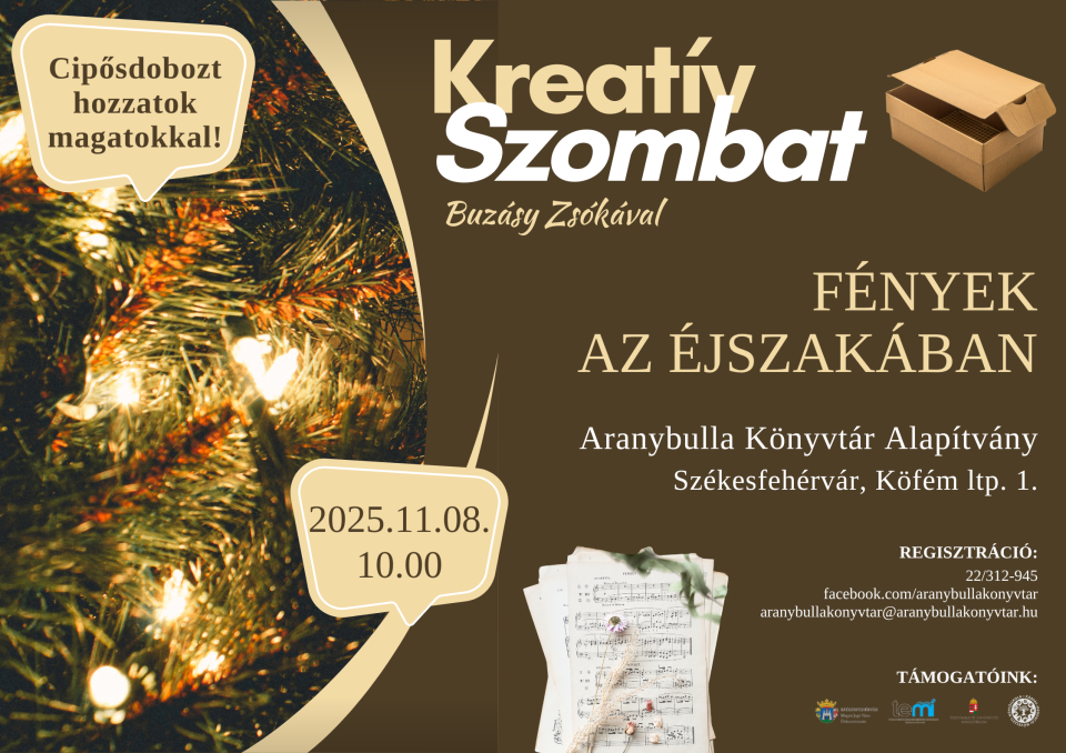 Cipősdoboz, kotta, fényfüzér. Kivételesen titokban tartjuk, mi születik belőlük. Készen álltok a kalandra? Az ugrásra az ismeretlenbe? Ha igen, cipősdobozt mindenképpen hozzatok magatokkal!A férőhelyek korlátozott száma miatt előzetes regisztrációt kérünk elérhetőségeink egyikén: 22/312-945, aranybullakonyvtar@aranybullakonyvtar.hu, facebook.com/aranybullakonyvtar