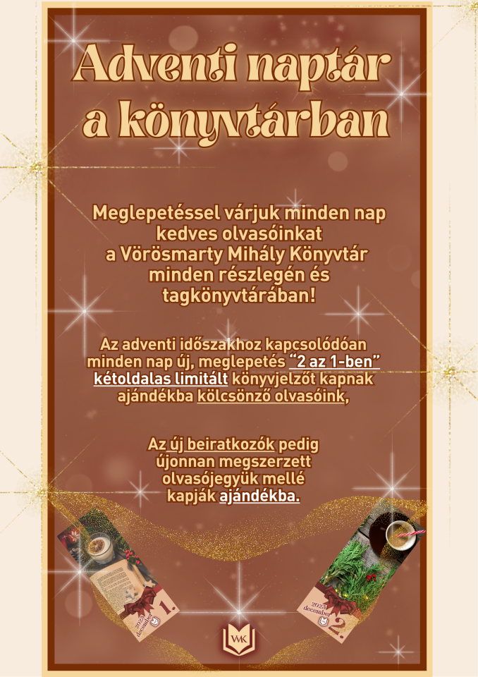 Az Adventi időszakhoz kapcsolódóan minden nap új, meglepetés “2 az 1-ben” kétoldalas könyvjelzőt kapnak ajándékba kölcsönző, és újonnan beiratkozó olvasóink.