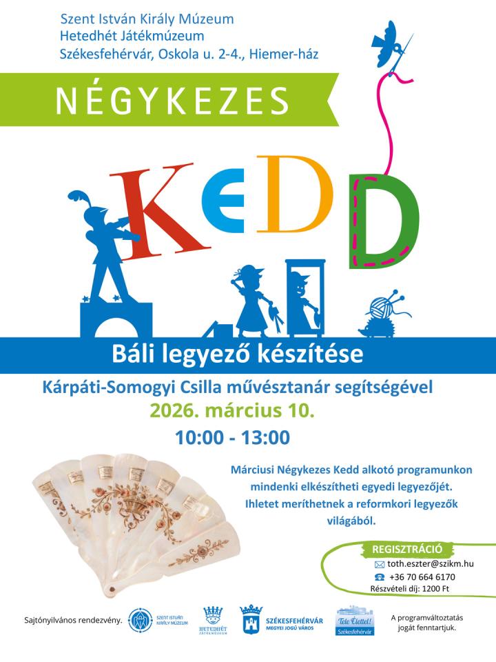 A résztvevők Kárpáti-Somogyi Csilla művésztanár segítségével készíthetik el egyedi báli legyezőiket a Hetedhét Játékmúzeumban!Ihletet meríthetnek a reformkori legyezők világából.