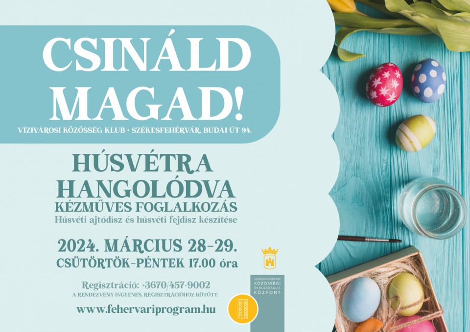 A húsvéti készülődés feldobja a családi délutánokat: a felnőttek és a gyerekek is szívesen kreatívkodnak, kézműveskednek, örömmel alkotnak tojásos és nyuszis dekorációkat. Az ünnephez közeledve ilyen vidám dekorációk állnak a Vízivárosi Közösségi Klub népszerű Csináld magad! sorozatának középpontjában is: az ingyenes workshopon tojásos ajtódíszt és nyuszis fejdíszt készíthetnek majd az érdeklődők kartonpapírból. A Székesfehérvári Közösségi és Kulturális Központ az alapanyagokat és a szükséges eszközöket biztosítja a kézműves délutánhoz.