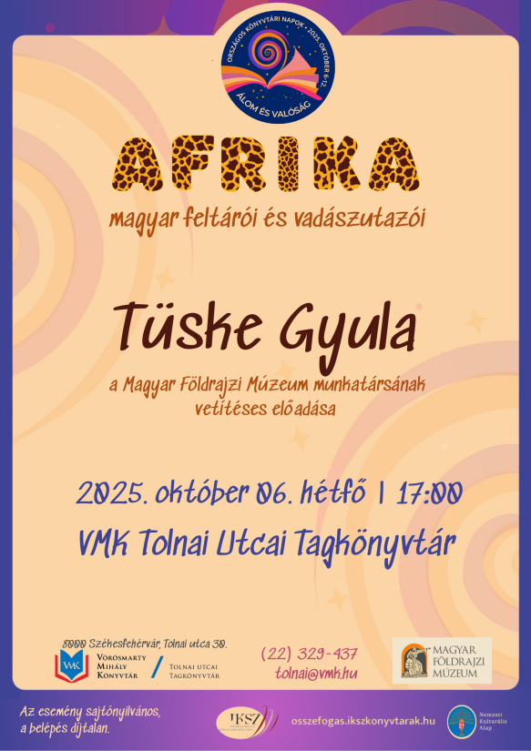 Tüske Gyula a Magyar Földrajzi Múzeum munkatársának vetítéses előadása 2025. október 06. hétfőn 17 órakor a Vörösmarty Mihály Könyvtár Tolnai Utcai Tagkönyvtárában.