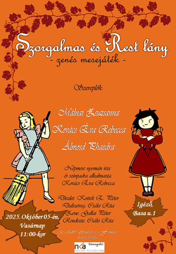Az RS9 Színházzal koprodukcióban készült előadás óvodás kortól szólítja meg a gyermekeket, akik a két leány vándorútjának aktív résztvevőivé válnak a közös dalolások segítségével és velük azonosulva jutnak el a szívet melengető feloldásigA szorgalmas és rest lány -zenés mesejáték.