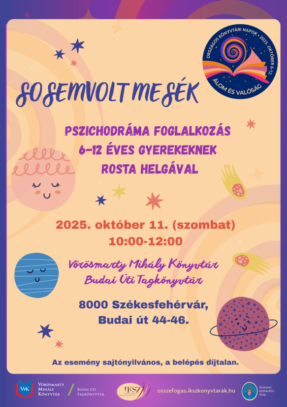Sosemvolt mesék Pszichodráma foglalkozás 6 -12 éves gyerekeknek Rosta Helgával. 2025. 10. 11. (szombat) 10:00-12:00 Vörösmarty Mihály Könyvtár Budai Úti Tagkönyvtár