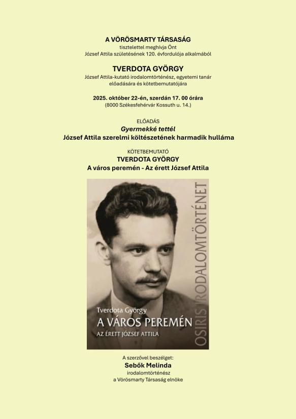 Tverdota György irodalomtörténész, egyetemi tanár előadása és kötetbemutatója József Attila szerelmi költészetének harmadik hullámát ill. az érett költőt mutatja be.