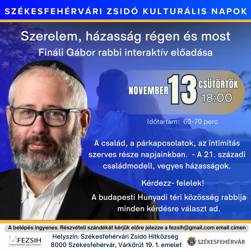 Fináli Gábor, a budapesti Hunyadi téri közösség karizmatikus rabbija, humorral és őszinteséggel vezeti végig a hallgatókat a zsidó családi élet és párkapcsolatok múltján és jelenén.