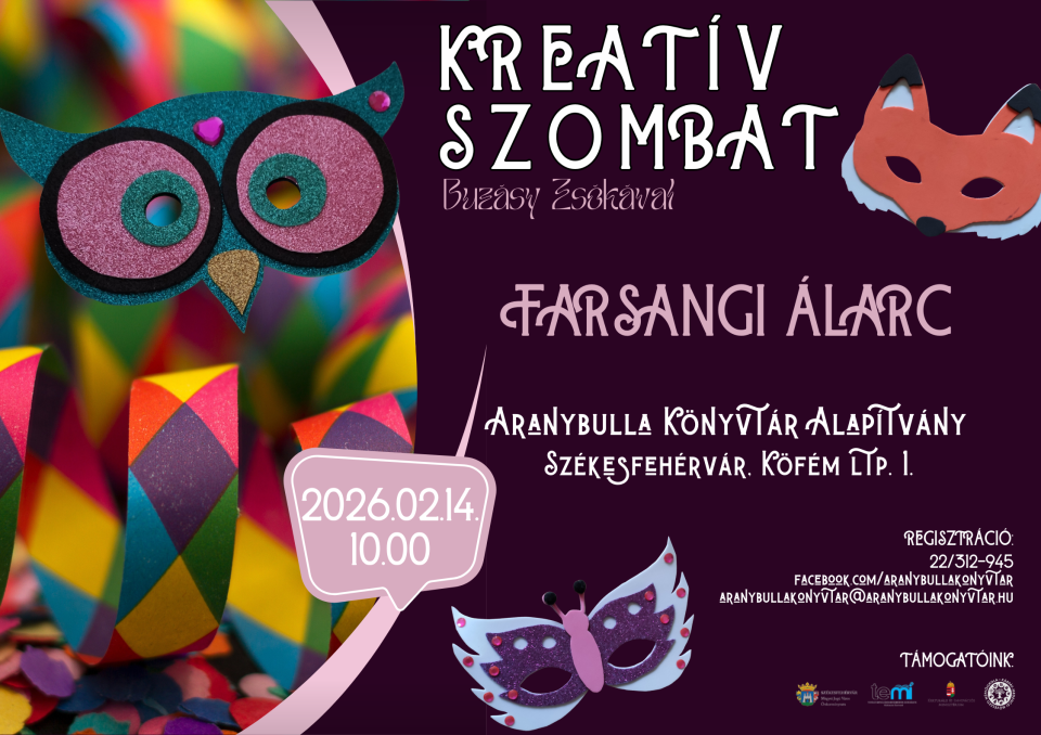 Tudjuk, hogy rögvest itt a farsang farka, de jövőre is lesz lehetőségünk maskarába bújni. Így aztán - bármilyen furcsán is hangzik - álarcot készítünk a szerelmesek napján.A férőhelyek korlátozott száma miatt előzetes regisztrációt kérünk elérhetőségeink egyikén: 22/312-945, aranybullakonyvtar@aranybullakonyvtar.hu, facebook.com/aranybullakonyvtar